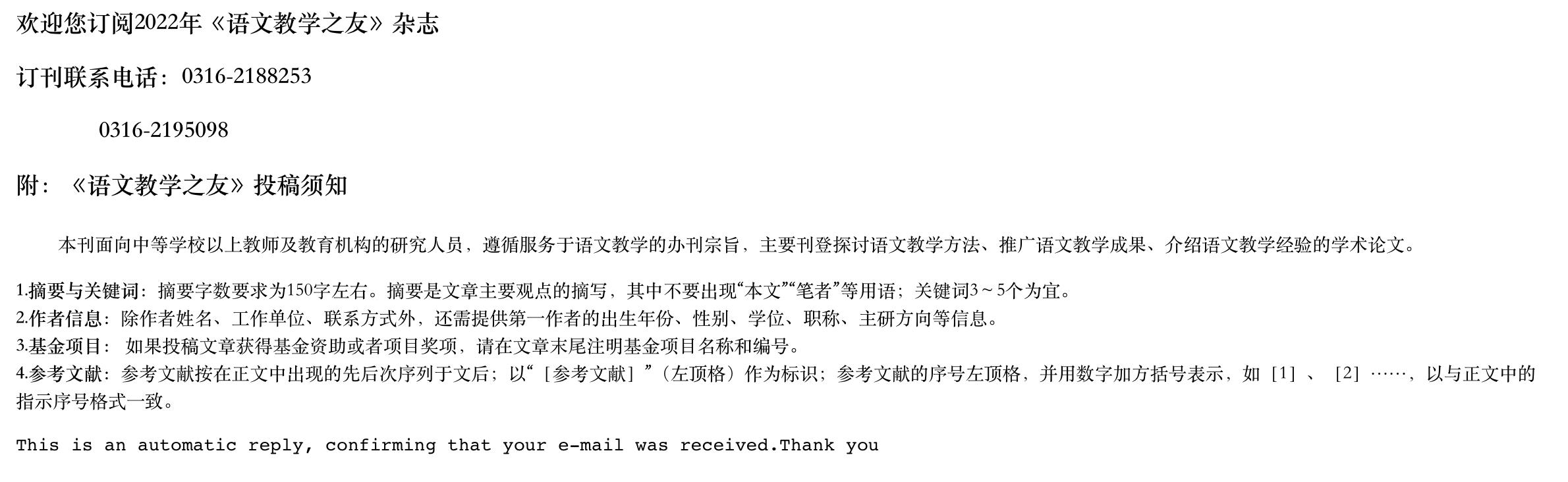 我的点评:2021.10.20投稿《语文教学之友》,在2021.11.24接到编辑部电话,说稿件质量可以,表格太多,排版不好看,需要减少表格。特地询问,不收版面费和审稿费。但是要“支持”他们的工作,需要订购他们的书籍。10套起订,420元。11.25日发回修改稿,12.13日打电话询问稿件,编辑说话很客气温柔,说尽快回复。14日发去邮件,没有任何回复。编辑一再强调,订书自由。但是稿件没有任何消息。过去两个多月了,没有任何明确回复。22日和23日连续两天打电话没人接听。有点耽误投稿人的时间。