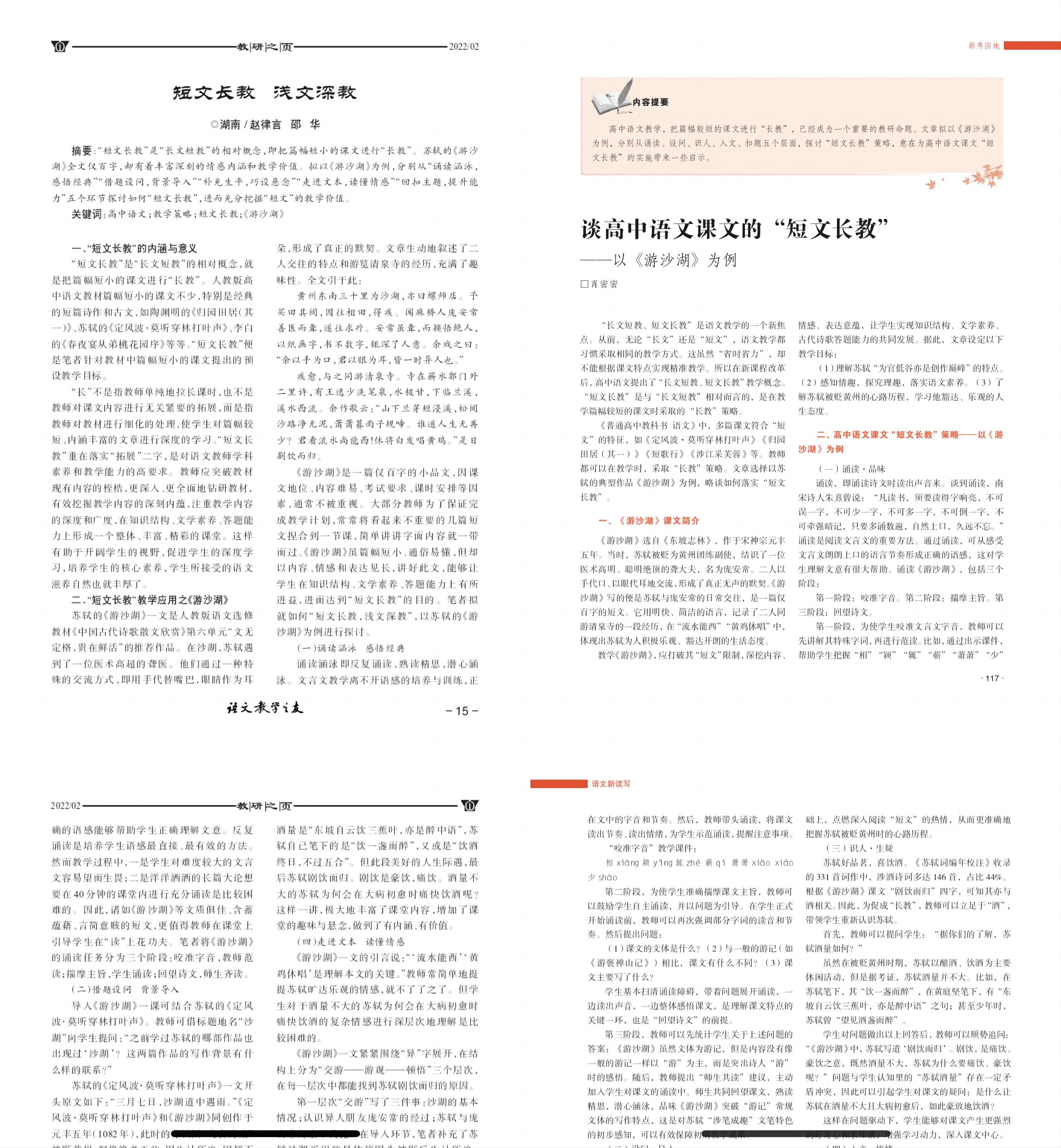 我的点评:这应该算是洗稿吧? 被洗稿:赵律言,邵华.短文长教浅文深教[J].语文教学之友,2022,41(02):15-17. 洗稿:肖密密.谈高中语文课文的“短文长教”——以《游沙湖》为例[J].语文新读写,2023,(07):117-119. 看作者简介,肖的这篇文章应该算是硕士毕业的小论文。万维没收录《语文新读写》,所以只能来《语文教学之友》这里分享了。