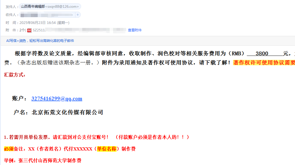 我的点评:2025年11月26日投稿后有自动回复,说只能开协办单位的发票,如果接收就回复正常送审。因为是基本自费发刊,所以没有特别要求。12月10日查稿,说在审核中,当天邮件回复了修改要求。12月11日再次发送修改稿。12月26日查稿,编辑说在审核中,审稿周期是一个月。1月7日收到通知,说通过初审,要交费,3800。收款方是文化公司,缴费后当天发回录用通知,历时1.5个月,后面陆续发来了发票,待正式见刊中。整体来说,费用不贵,3个版面,5000字符左右,这个价格比较良心,而且是可以上知网和万方。