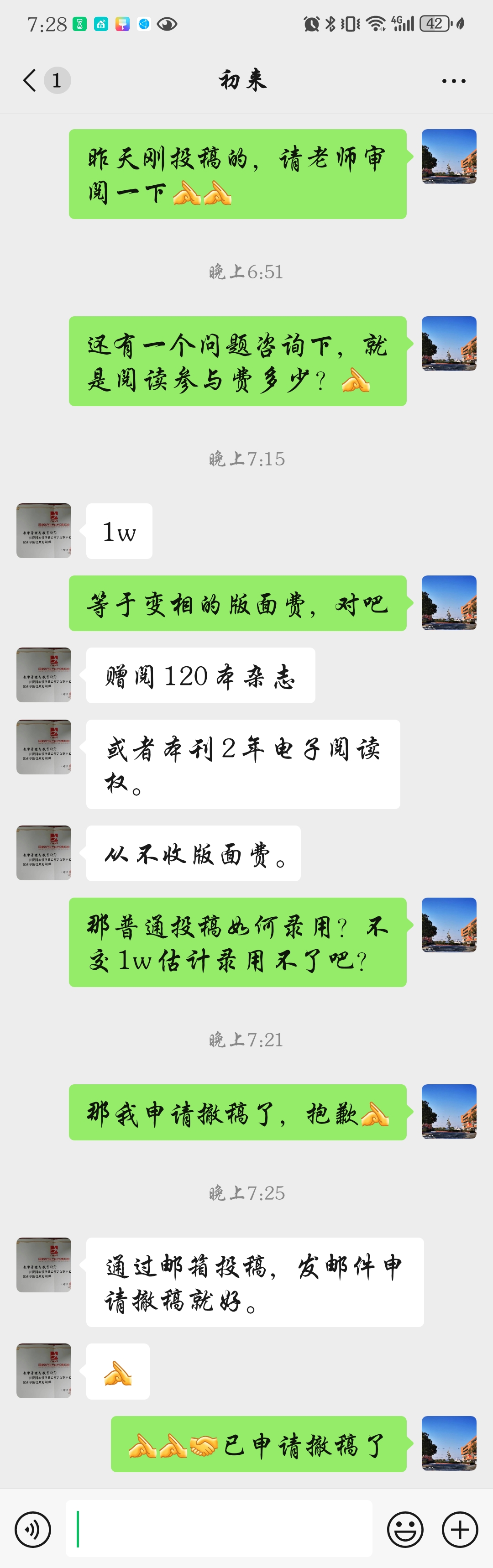 我的点评:编辑部和某个国家级学会共享投稿邮箱,如果稿件录用会从邮箱或者加微信通知,确实不收版面费,但是要交一个优秀教育人共阅计划,6000的费用,会附赠120本杂志,着实高了一些。