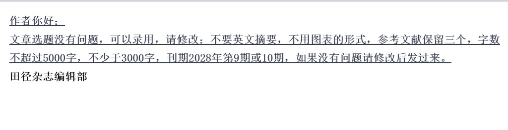 我的点评:你好,文章内容不符合,不能录用。田径运动教学或训练的内容,田径运动营养和运动创伤的内容,所有运动项目的体能训练内容可以发。不要英文摘要,不要图表的形式,参考文献保留三个,4000字起发。QQ发去并没有接受文件,还是建议大家用用邮箱投稿。
