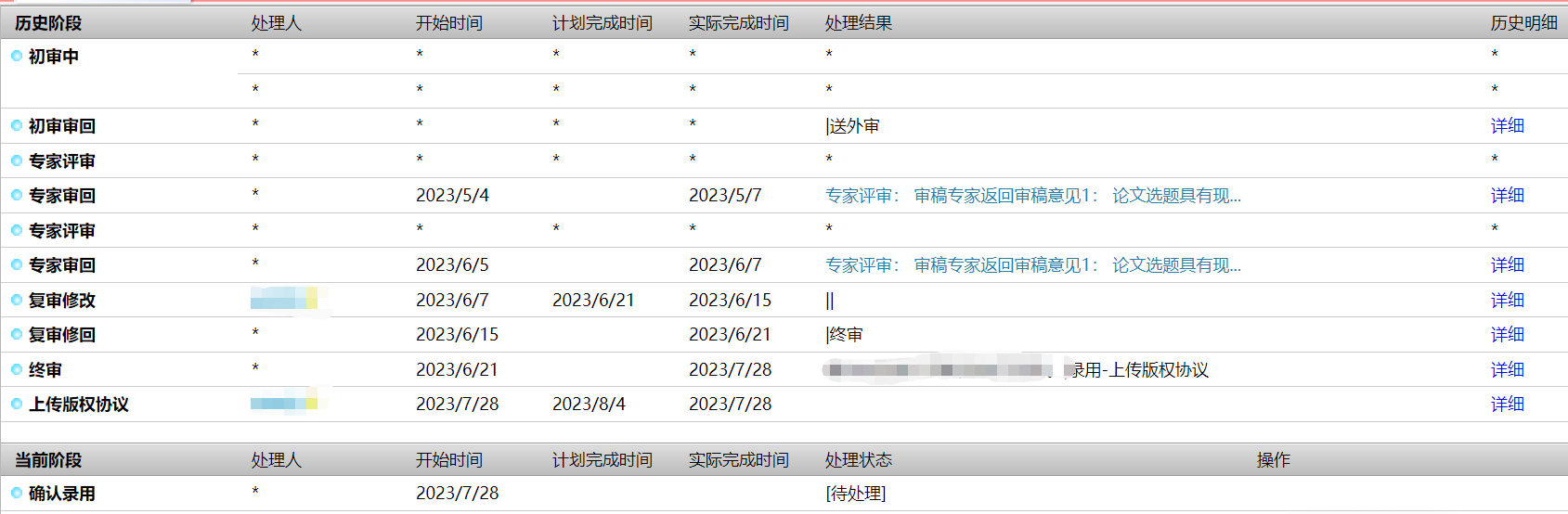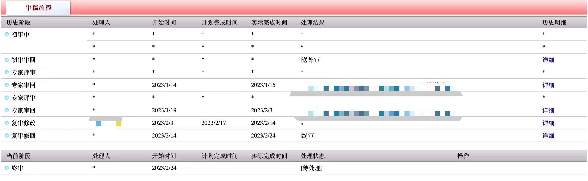 我的点评:投稿时间22年9.29,初审,二次外审,一次终审,历时正好6个月。外审意见偏好,没想到终审意见仅是:观点证据支持不足。文章不录用估计是自身质量不过硬,但是我对6个月的审稿时间已无力吐槽,害得我白等半年。以后我会敬而远之,等不起,更伤不起。