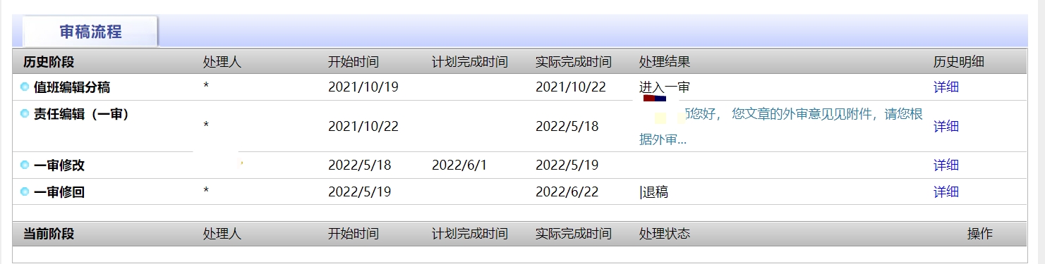我的点评:7月底投稿就显示开始分稿,8月初就进入一审,现在9月19日了还在一审,看有些老师一审过了3个月就告知自行处理,也有老师说马哲方向的一审和外审是一起的,不知是否如此。