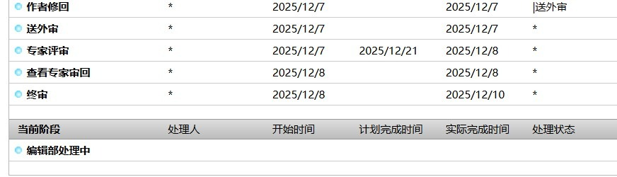 我的点评:导一硕二,外审超期了一个多月,审回后直接终审拟录用,卡在“发用稿通知【录用】——待处理”这一步十多天了,还没收到录用邮件通知,整体流程已经三个多月,编辑部电话全程打不通,站内信息和邮箱也不回,前几天又正好看见编委会换届的通知,不会在录用环节把我鸽掉吧