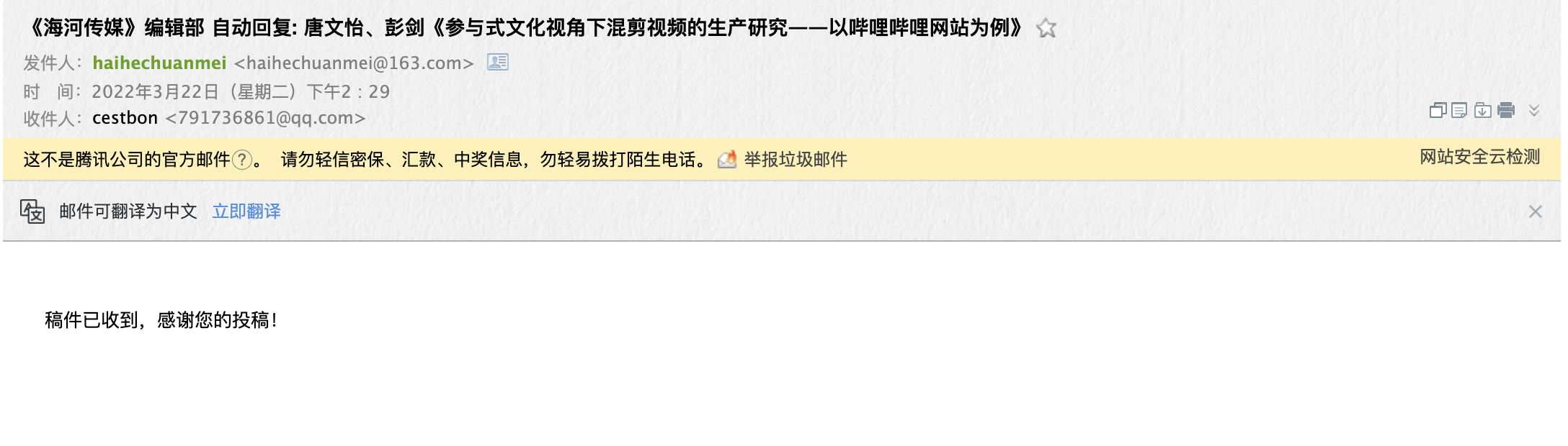 我的点评:记录下投稿,2024.6.27向该期刊邮箱haihechuanmei@163.com投稿。有自动回复:“稿件收到,感谢投稿!请注意,稿件标题下一定要有作者姓名,方便查重;本刊用脚注连续排序,要具体到引文页码;如果传的是修改稿件或撤稿申请,要在邮件标题开头标注清楚。”