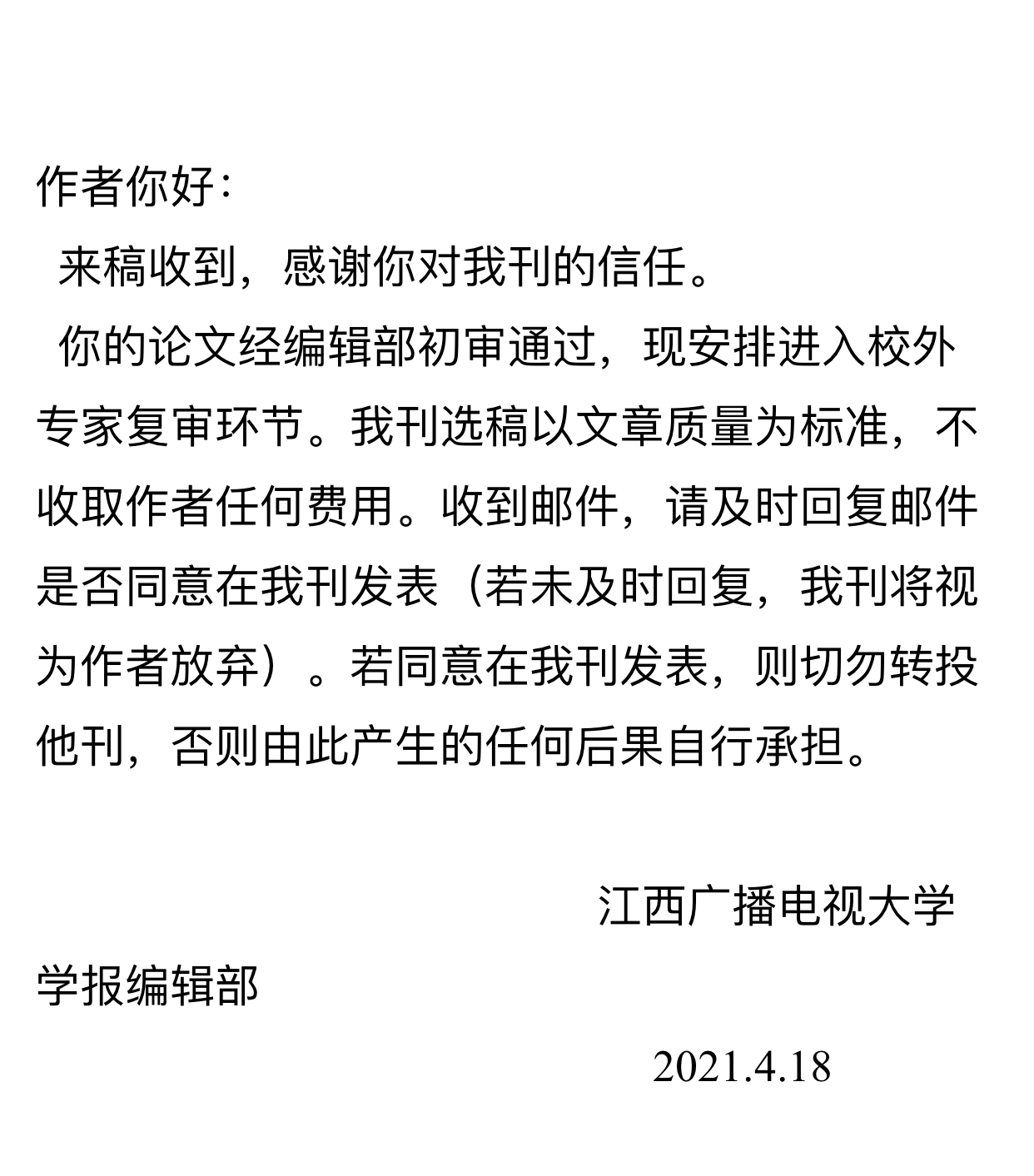 我的点评:本月15日投稿,18日21:00左右收到初审通过的邮件。现进入外审,后续有情况再评论~保佑吧。