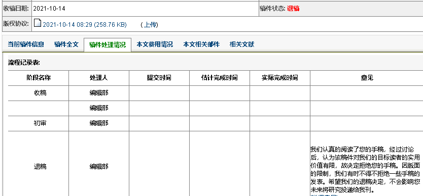 我的点评:官网投稿,流程清晰,投稿一天后回复收稿邮件,三天后退稿,效率很高,不耽误事,业界良心