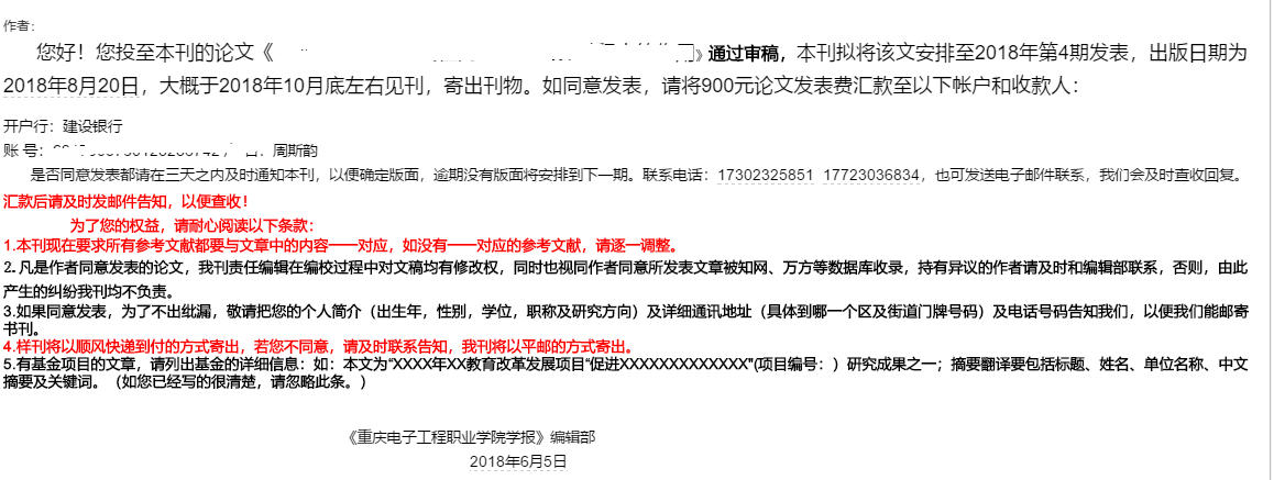 我的点评:我投了这个期刊,不知道他们给我发的邮件通知是骗子吗? 这个叫周斯韵是这个编辑部的吗?希望管理员核实一下邮件。邮件写着:通过审稿, 本刊拟将该文安排至2019年第3期发表,出版日期为2019年6月20日,大概于2019年7月底见刊,寄出刊物。如同意发表,请将850元论文发表费汇款至以下帐户和收款人: 开户行:建设银行 账 号:6217003760123286742 户 名:周斯韵 是否同意发表都请在三天之内及时通知本刊,以便确定版面,逾期没有版面将安排到下一期。联系电话:17723036834(微信同号) ;17302325851 ,QQ:1394770529,也可发送电子邮件联系,我们会及时查收回复。汇款后请及时发邮件告知,以便查收!请问这是正常的吗?