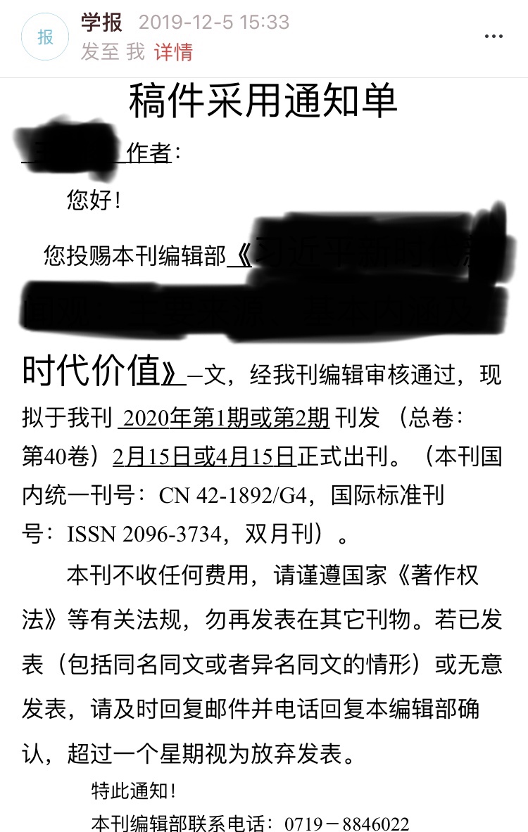 我的点评:本人一作,导师二作。投稿一个多月后,收到用稿通知,要求重复率降到10%以下,要求字数将低至8000左右。修改后,录用。