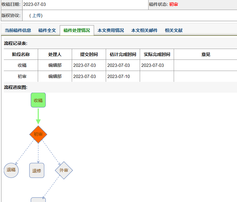 我的点评:投稿近半月,流程上显示9号初审结束,但是现在状态是再审,这是要退稿的节奏吗?这个刊审稿是不是越来越慢了?