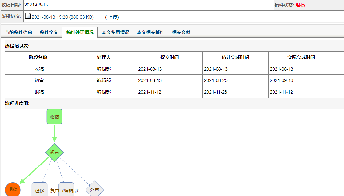 我的点评:投稿一个半月,经历了收稿-初审-复审-复审-外审,现在外审结束,正在终审(主编),保持终审(主编)状态已经12天了。不知道接下来是拒稿还是再送两个外审。期间经历退还其他编辑,不知道是不是经历了终审前总审。总之,每个步骤结束好像还要让主编看一眼?