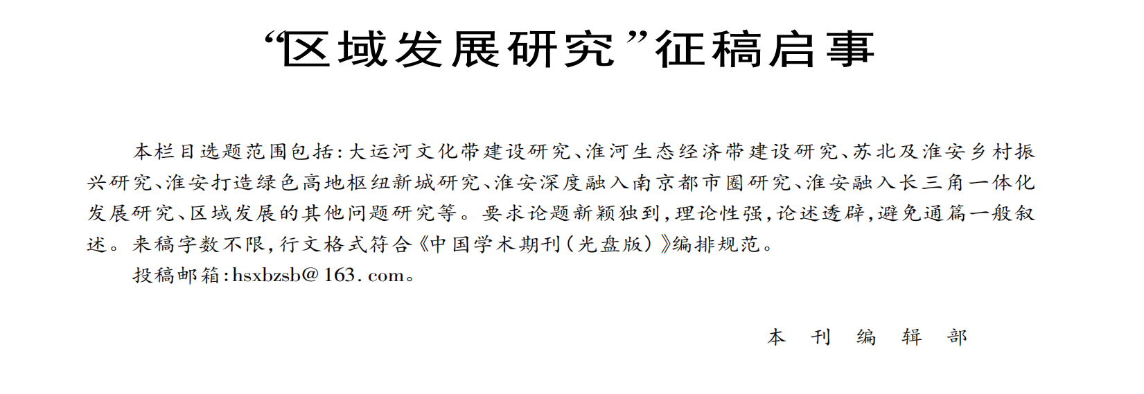 本栏目选题范围包括:大运河文化带建设研究、淮河生态经济带建设研究、苏北及淮安乡村振兴研究、淮安打造绿色高地枢纽新城研究、淮安深度融入南京都市圈研究、淮安融入长三角一体化发展研究、区域发展的其他问题研究等。要求论题新颖独到,理论性强,论述透辟,避免通篇一般叙述。来稿字数不限,行文格式符合《中国学术期刊(光盘版)》编排规范。