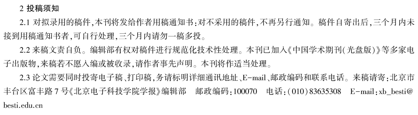 请更新:《北京电子科技学院学报》知网收录,已经更新到2020年第2期,见官网:https://navi.cnki.net/knavi/JournalDetail?pcode=CJFD&pykm=XBBT。征稿启示每期都印出来,见截图。要求打印版和电子版同时发送,投稿邮箱:xb_besti@besti.edu.cn,字数要求6000-8000字。