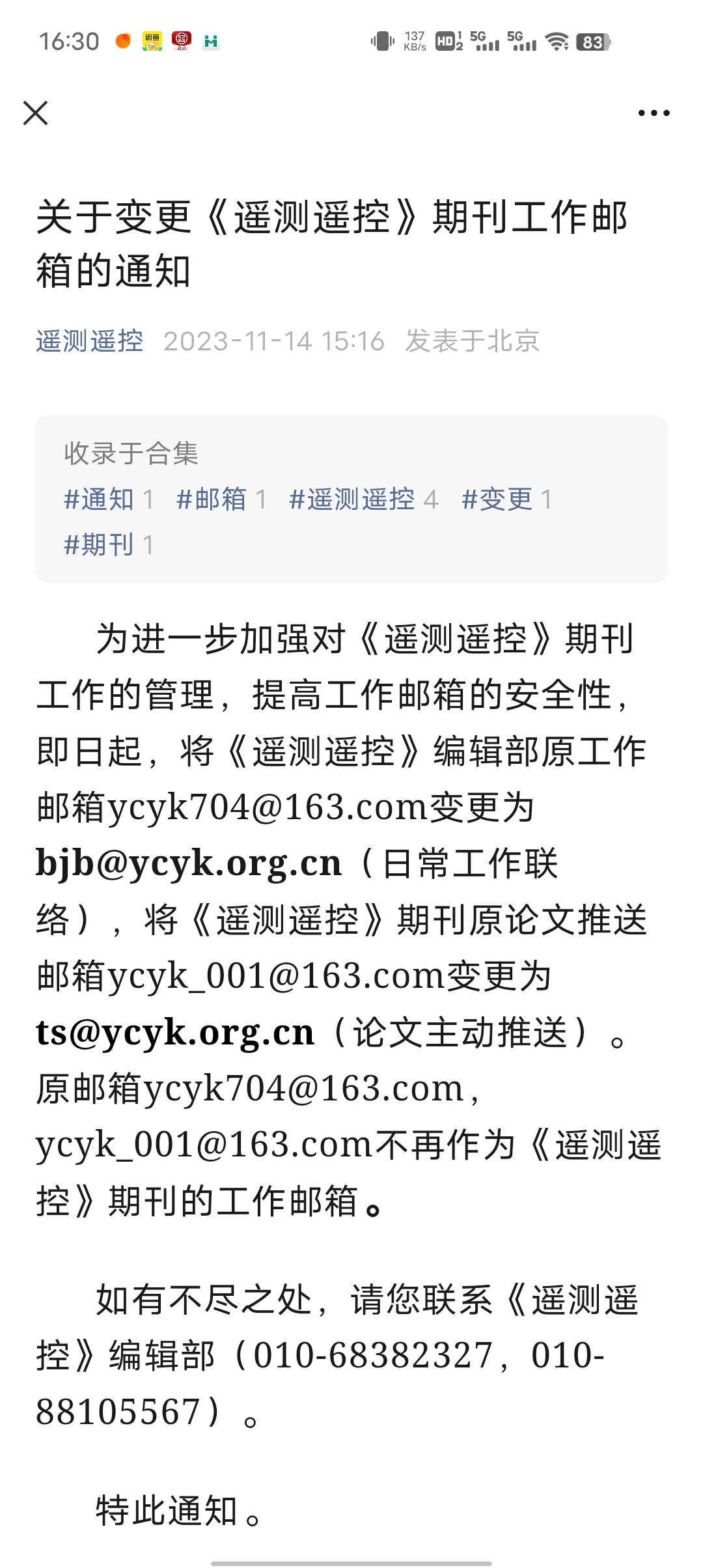 根据公众号消息,该刊一个编辑部电话变了,并且通联邮箱变更,https://mp.weixin.qq.com/s/M3oKSwUULpMW7myxRNN_4g
