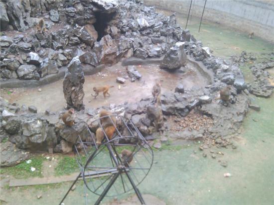 我们首先到达的是猴山,是一座人工假山,很小,高高的围墙围成一个规则的圆, 假山上大大小小二十几只猴子,应该就是猕猴,它们在山上,而我们却在高处。当我们一行站在墙外欢呼的时候,它们似乎在目迎,都望向了我们,许久。起初我并不知道这是为什么,后来有同学往里边扔了可以吃的东西,它们兴奋不已,由此我才明白,或许它们此时正饿着,我们的一级保护动物。